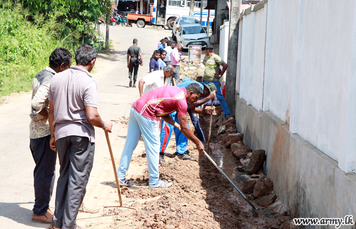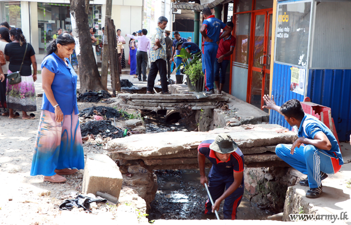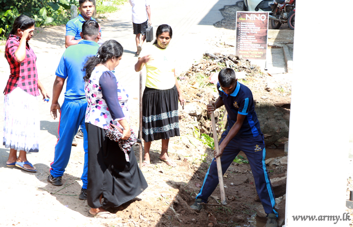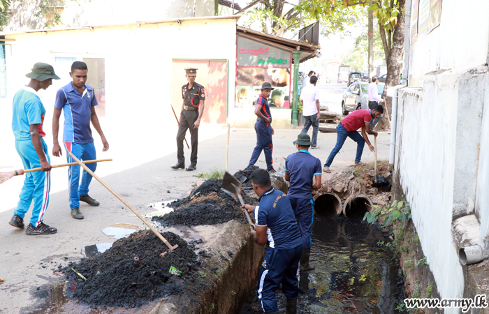 By responding to the request made by the school Principal, Major General Mahinda Mudalige, Commander Security Forces - West dispatched a group of 42 Army personnel including two Officers to attend to the cleaning project. With the support of parents and students, troops cleared those drains and removed garbage that remained stagnant inside within a couple of hours.