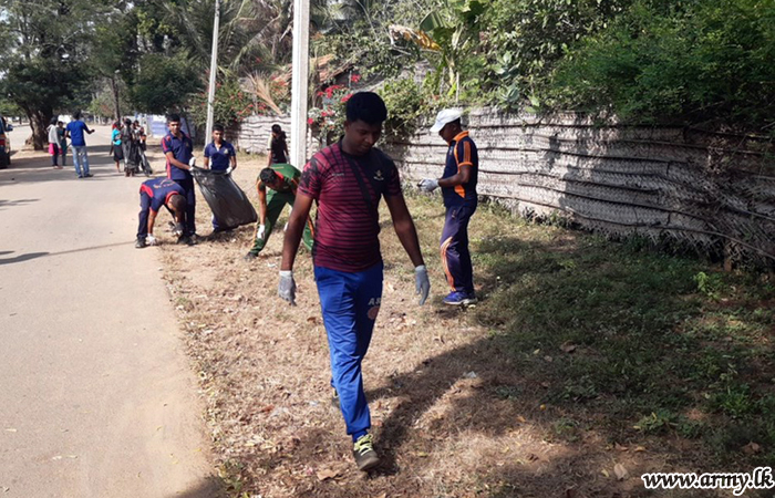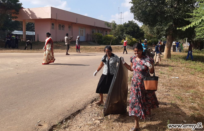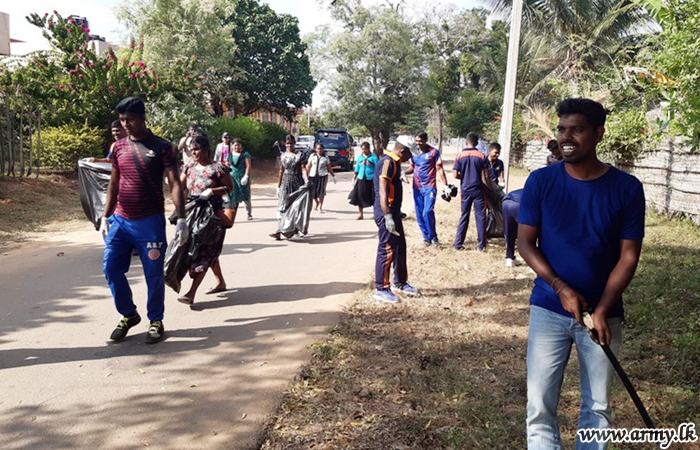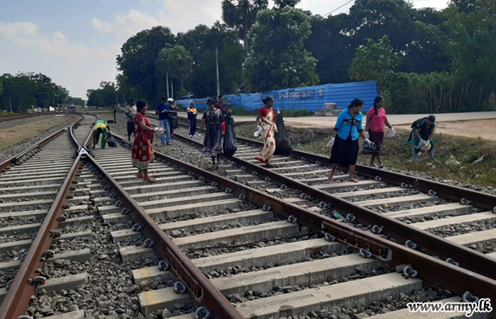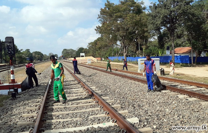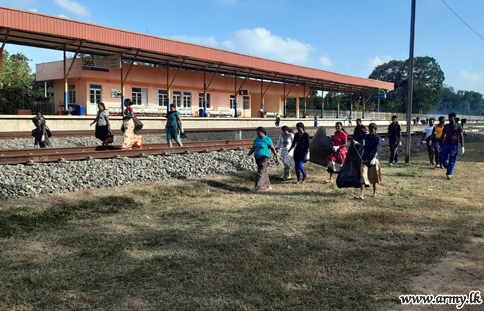 Troops of the 571 Brigade and 21 members of ' MAS Kreeda Vaanavil' Garment Factory joined hands together and cleaned the Railway Station Kilinochchi premises on Sunday (16).