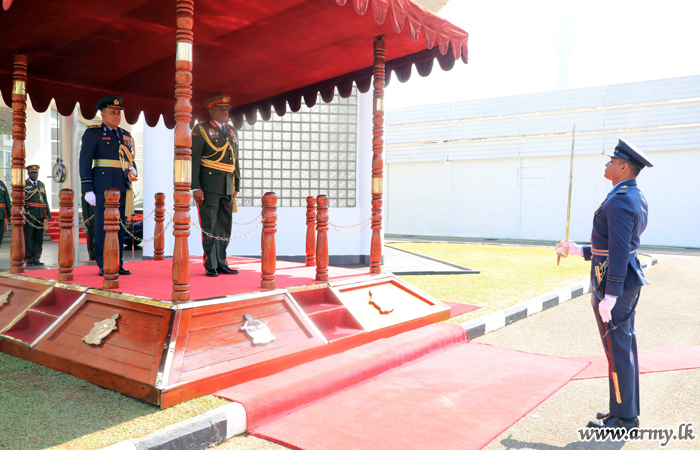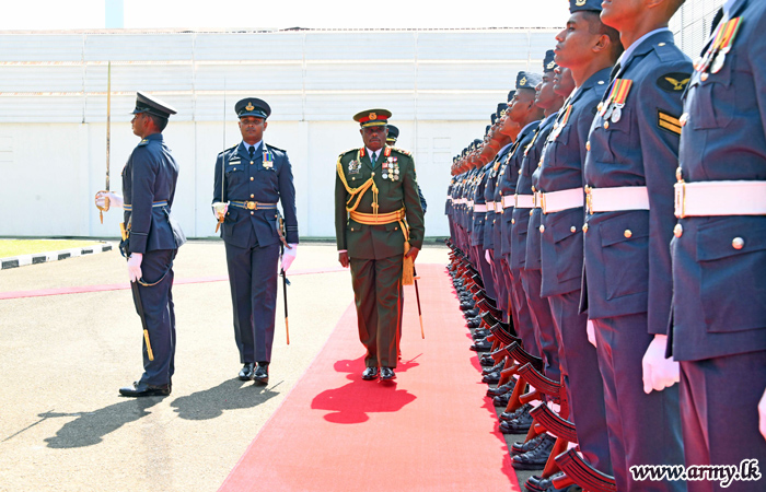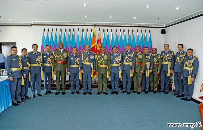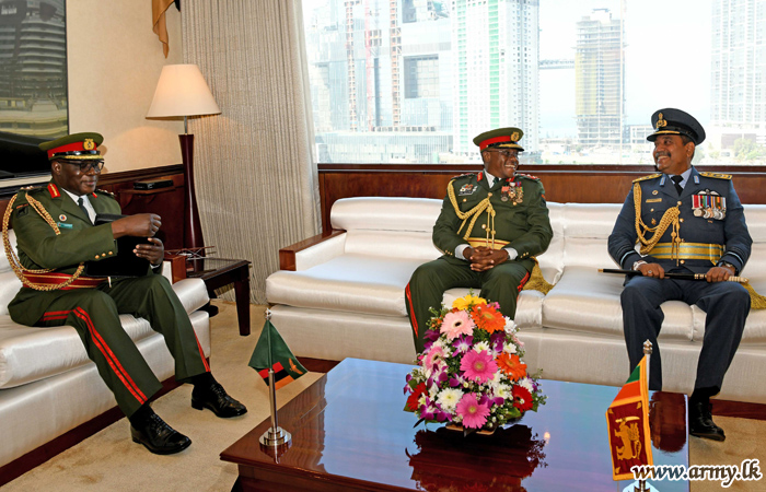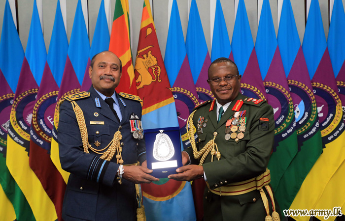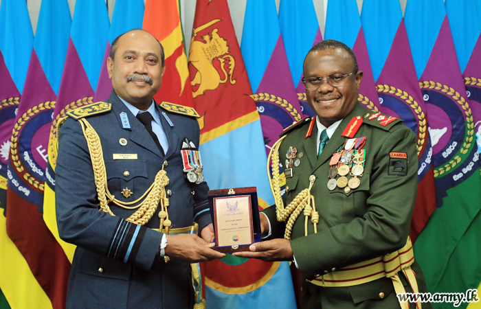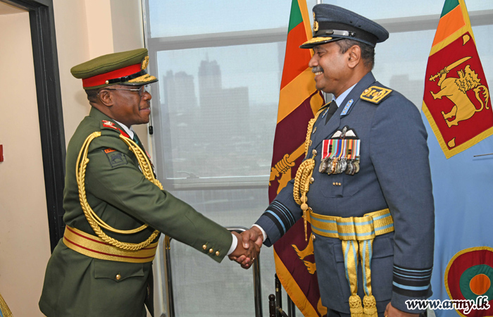 The Zambian Republic’s Army Commander, Lieutenant General W.M Sikazwe psc DIP (DSS) MA (DSS), now in Sri Lanka paid a courtesy call on the Commander of the Air Force, Air Marshal Sumangala Dias at the Air Force Headquarters, Colombo on Monday (23) evening after his cordial reception at the Army HQ a few hours ago. He was accorded a Guard Turnout and a Guard of Honour upon his arrival at the venue, together with his delegation.
