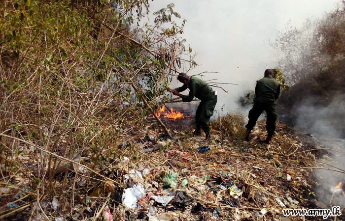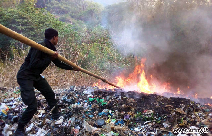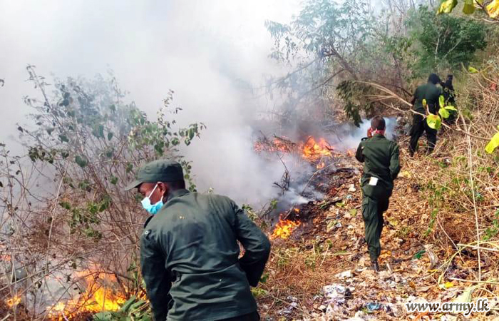 Troops of 1 Sri Lanka National Guard (SLNG) under command to the 143 Brigade of the 14 Division under the Security Force HQ - West Saturday afternoon (29) rushed to prevent a fast spreading bush fire in the general area of Yanthampalawa, Sundirapola Garbage dump in Kurunegala.