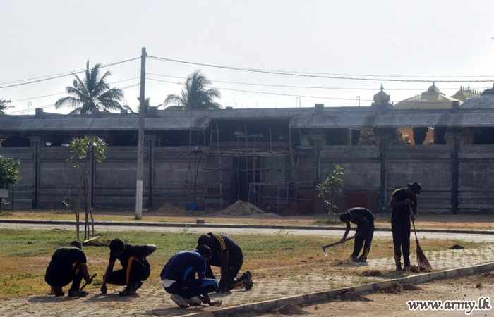 A record group of 10 officers and 300 plus troops, together with devotees and civilians on Tuesday (3) joined hands together and carried out a mega Shramadana campaign in and around the famous Wattappalai Amman Kovil premises since the location is visited by hundreds of devotees on daily basis.