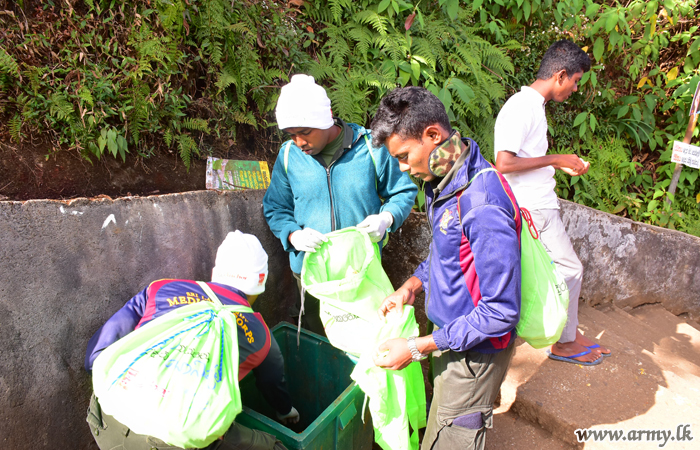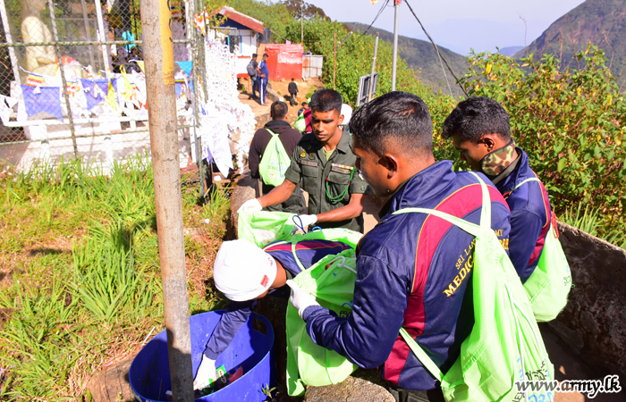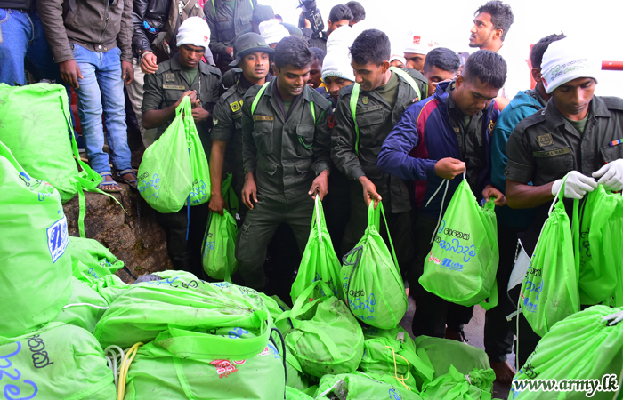 Troops serving under the Security Force HQ-Central in collaboration with 'Manusath Derana' community project collected more than 6 tons of plastic pollutants, left behind along the Nallathanniya to Sripada road patch during a mega 'Shramadana' project on Saturday (7) under the guidance of Major General Laksiri Waduge, Commander, Security Forces-Central.