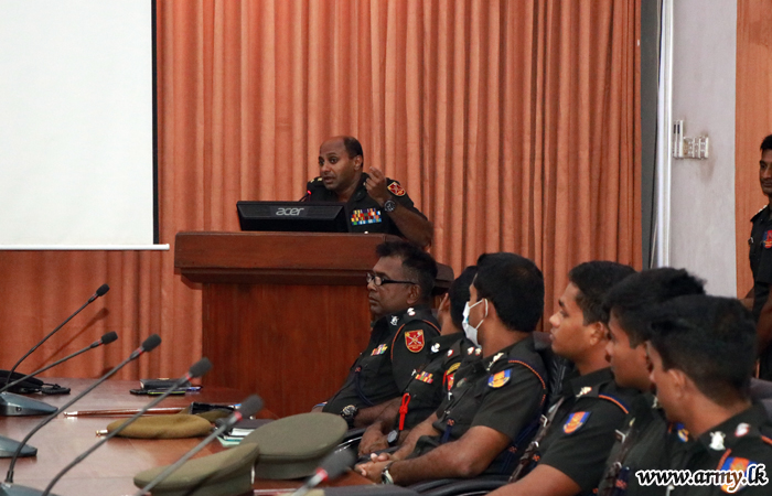 A large group of Officers and Other Ranks serving the Security Force HQ-West (SFHQ-West) on Wednesday (18) assembled at the SFHQ-West auditorium and received a comprehensive account and updates on the prevention of COVID-19 outbreak from Lt Colonel Chandimal Welagedara, Coordinating Officer of the SFHQ-West.