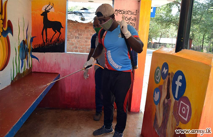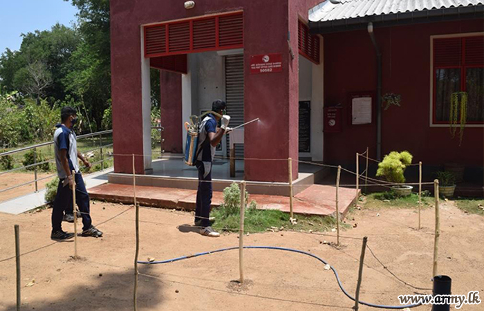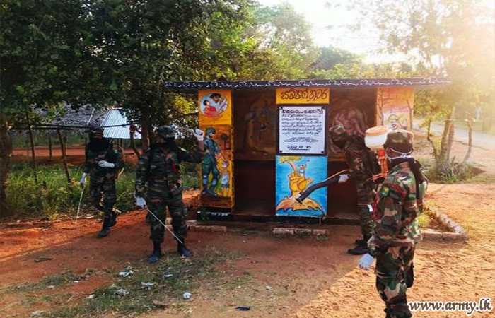 Sampathnuwara Divisional Secretariat office, Mahaweli L Zone office, Sampathnuwara Hospital, Bus Halts, BOC bank premises and the ATM machine area too were covered during the project. The Commanding Officer and troops of the 14 (V) SLLI with 5 spray machines with Health officials conducted the community project.