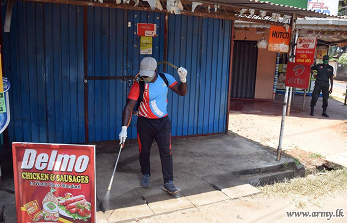 In view of the looming threat of COVID-19 pandemic, 14 (V) Sri Lanka Light Infantry (SLLI) troops of the 62 Division in the Ethawetunuwewa under the Security Force HQ-Wanni disinfected the entire township of Sampathnuwara on Monday (23) with the assistance of the Sampathnuwara MOH office by spreading anti-virus and bacteria chemicals during curfew hours.