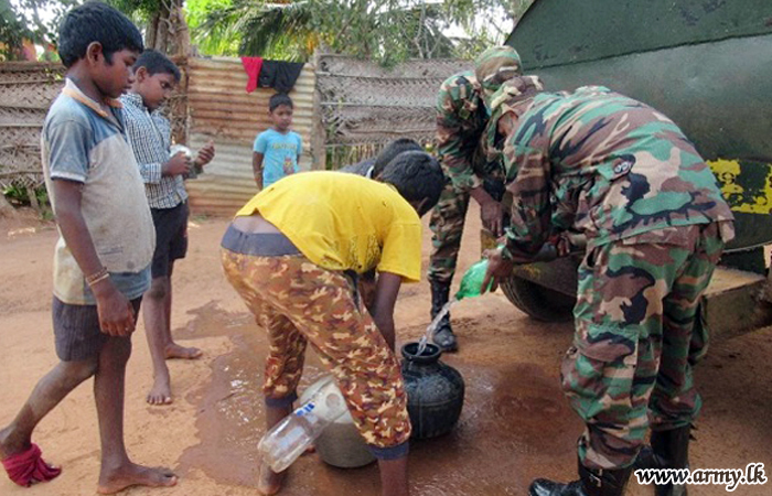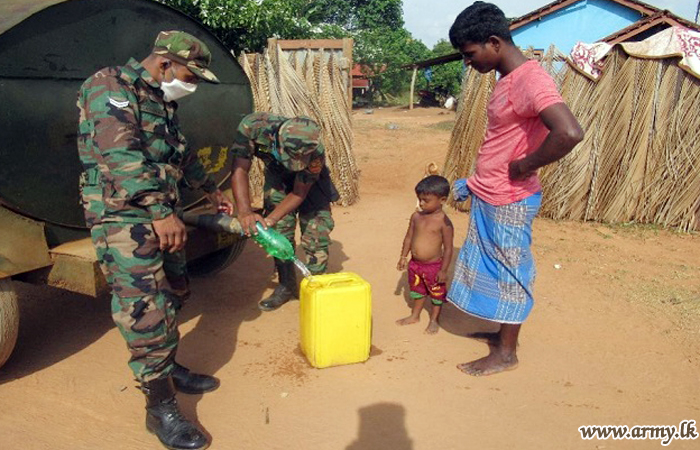 Under the direction of the Commander, Security Forces - Kilinochchi, Major General Jayantha Gunaratne and the close supervision of the 57 Division and the Commander 572 Brigade, Brigadier D.M.P.P Dasanayaka, 572 Brigade troops distributed a large quantity of pre-cooked meal packets and drinking water among the worst-affected civilians in the general areas of Vishwamadu on Thursday (26).