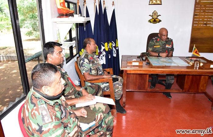Major General Jayantha Gunaratne, Commander Security Forces, Kilinochchi, held a meeting with key law enforcement authorities to discuss current threats posed by COVID-19 pandemic, preparedness of the Security Forces against the threat, response plans in Kilinochchi, etc on Thursday (26) during a visit to the 19 Sri Lanka Light Infantry Headquarters in Vellankulam area.