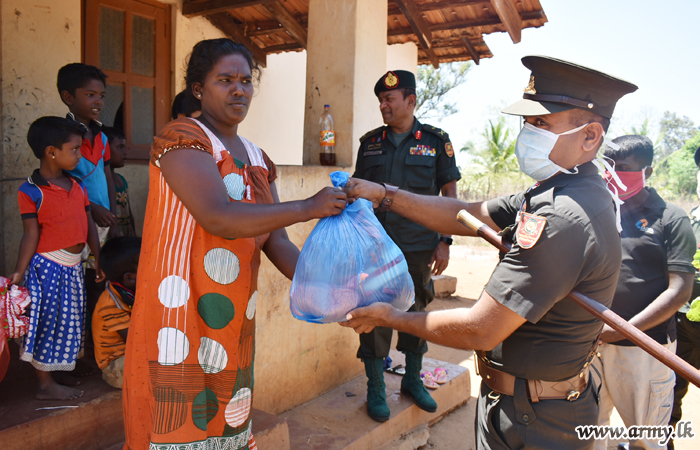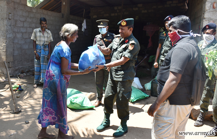 65 Division troops under the Security Force HQ-Kilinochchi on Tuesday (31) distributed dry ration and fresh vegetable packets among 25 selected low-income group families in Thunukkai and Uyilankulam area in close coordination with respective Grama Seva officials.