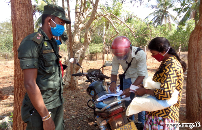 19 Sri Lanka Light Infantry (SLLI) troops serving under the 65 Division of the Security Force HQ-Kilinochchi provided transport facility to distribute government's relief ration packets among 258 Samurdhi beneficiaries in Thewanpiddi and Vellankulam areas in Kilinochchi on Thursday (1)