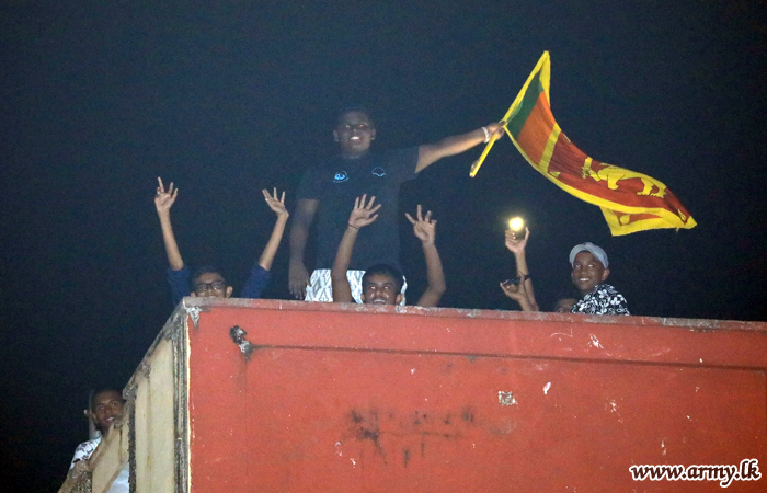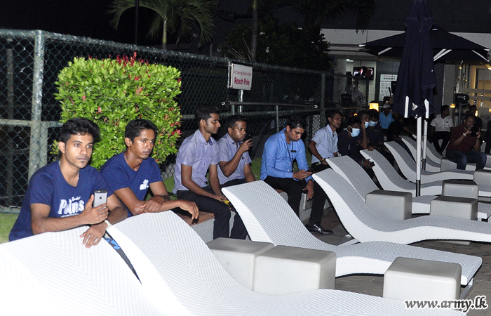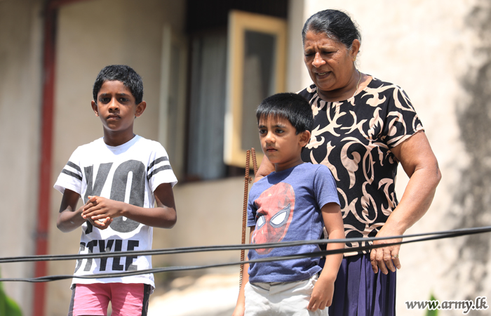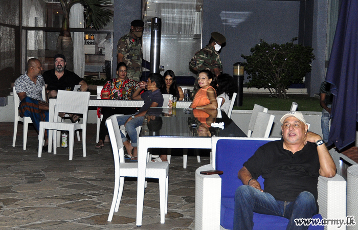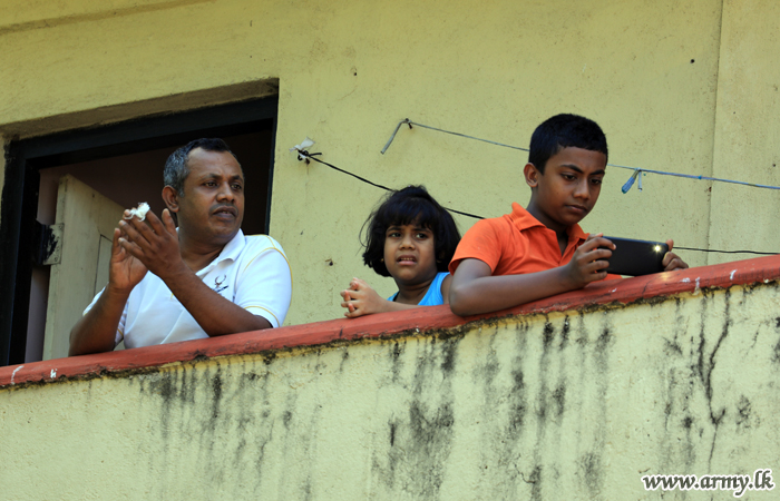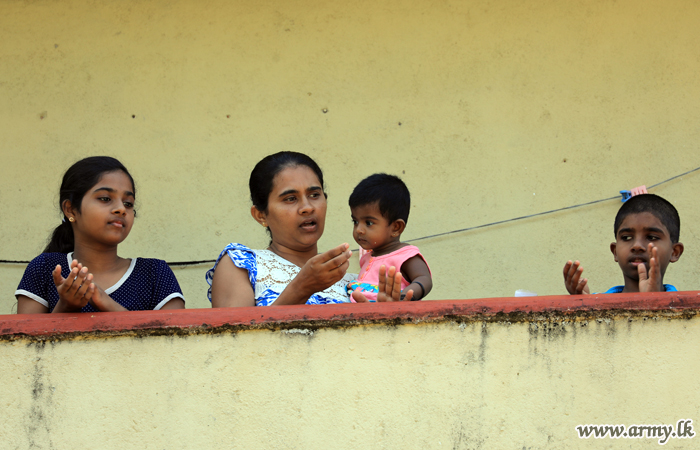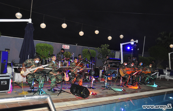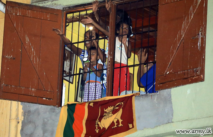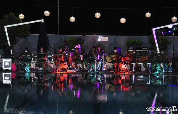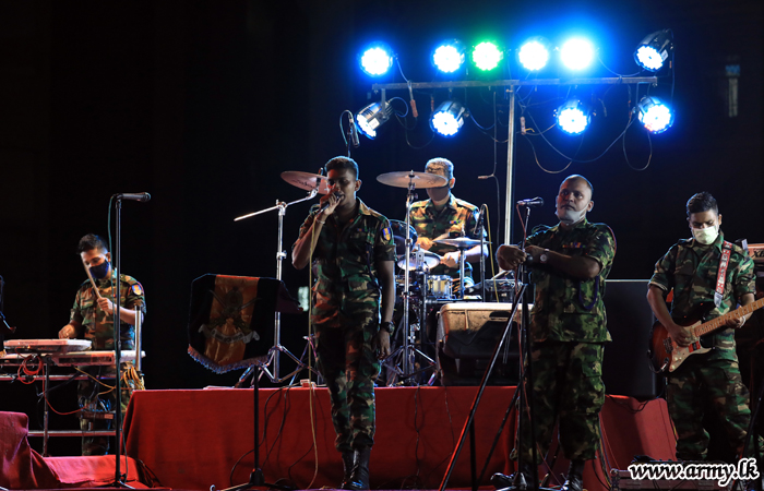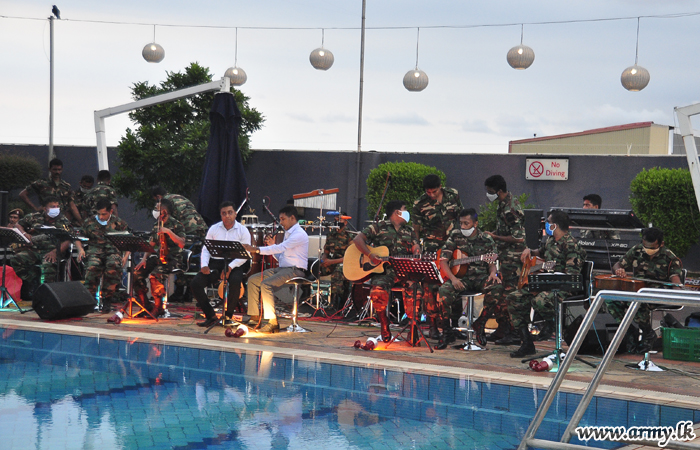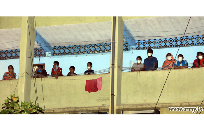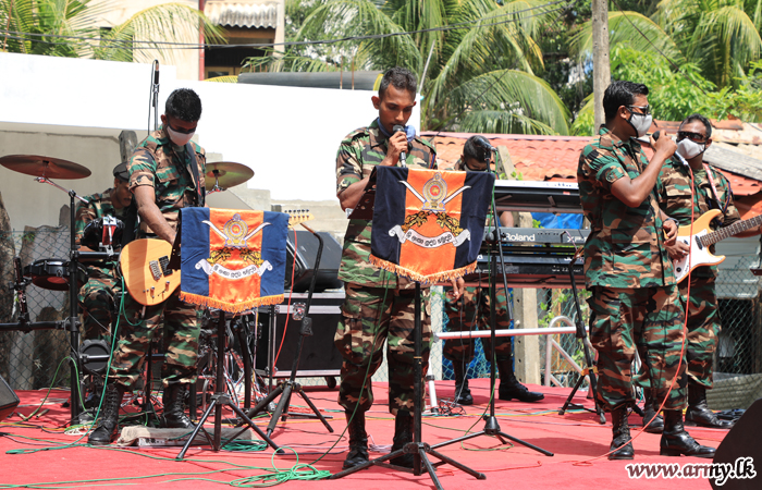Members of the Army Beat Group on the guidelines given by Lieutenant General Shavendra Silva, Head of the National Operation Centre for Prevention of COVID -19 Outbreak, Chief of Defence Staff and Commander of the Army showcased their musical talents during the arrangements to the cheers of those occupants.