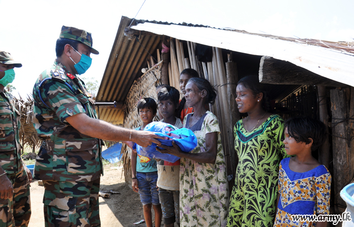 Troops of 1 Sri Lanka Sinha Regiment (SLSR) of the 572 Brigade of the 57 Division of the Security Force Headquarters - Kilinochchi, considering the difficulties faced by a section of the needy people distributed 32 packs of dry rations and essentials among 32 needy families in Korakkankaddu Grama Niladari Division in Kilinochchi on Saturday (11).