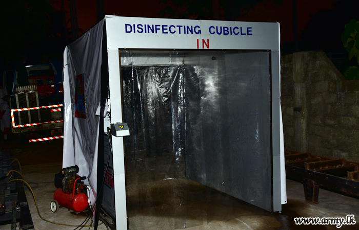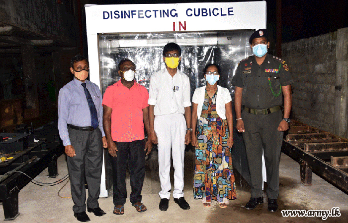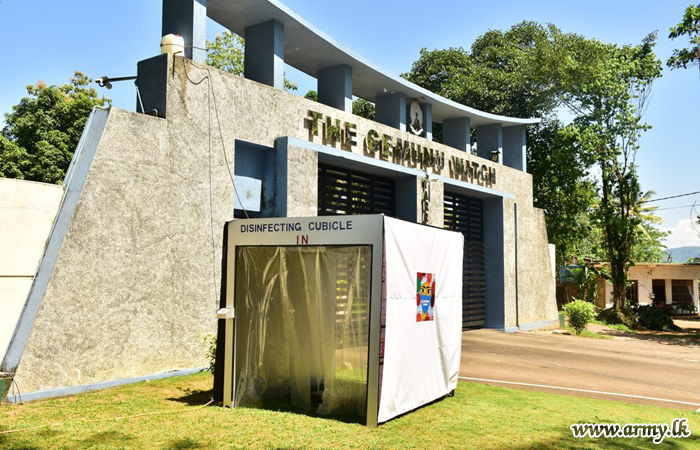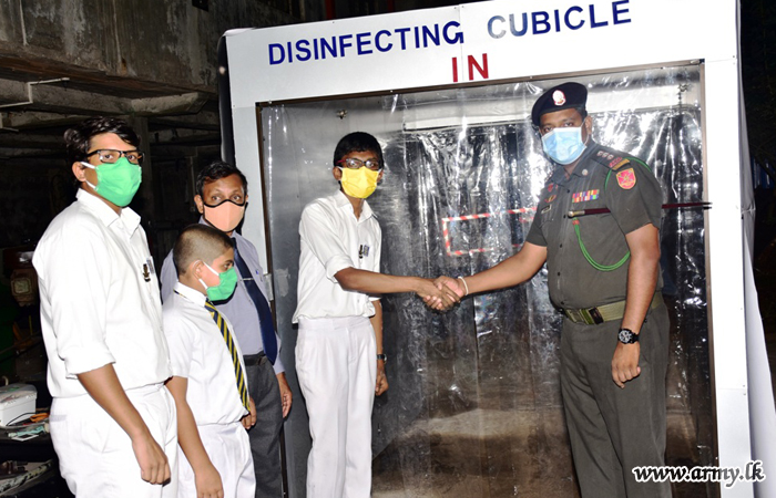 A disinfection chamber, innovated by a three-member group of students, Navidu Nikith Weerarathne of Grade 12, Loneth Fernando of Grade 7 and Ansara Ayodhya Wimalasinghe of Kegalu Vidyalaya was donated to the Gemunu Watch (GW) Regimental HQ at Kuruwita on Saturday (18) for use in necessary places manned by the Army.