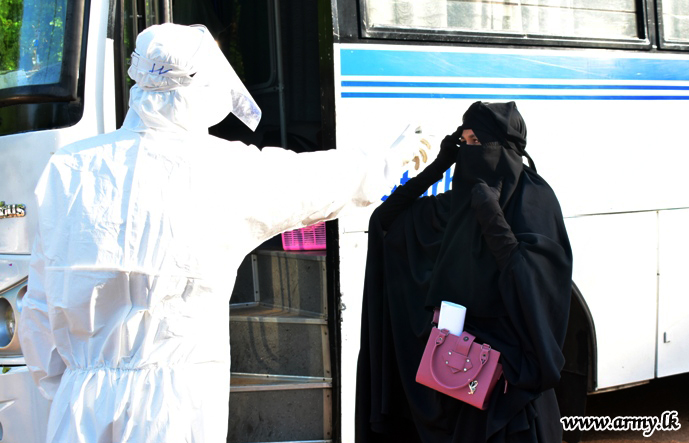 The returnees were provided water bottles, lunch packs and transport from the Army to their home towns in Puttalam and Colombo. The Commanding Officers of the QCs were there to see them off. |