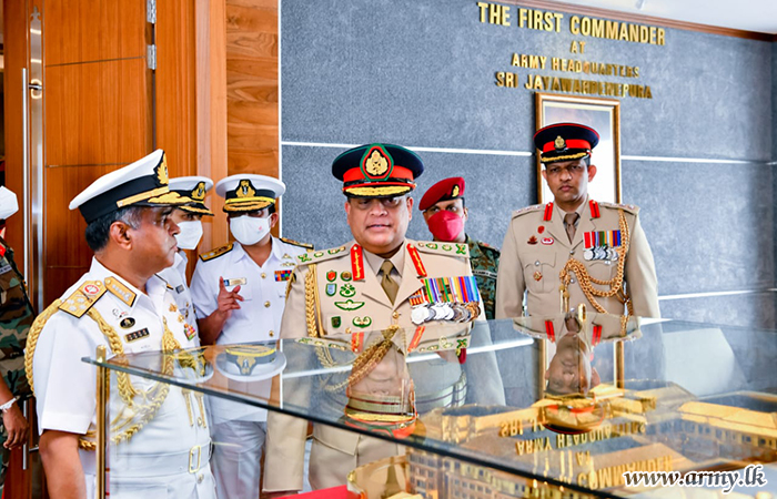 At the main entrance to the Commander’s secretariat, his host, General Shavendra Silva, Chief of Defence Staff and Commander of the Army warmly received Bangladesh’s Chief of Naval Staff and introduced Principal Staff Officers and Senior Officers at the Army Headquarters to the visiting Chief of Naval Staff.
