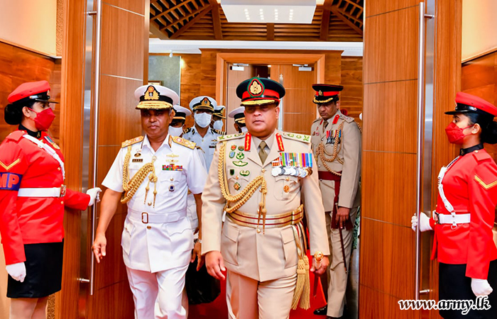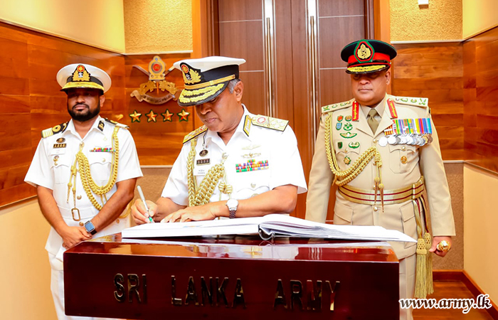The Chief of Naval Staff of the Bangladesh Navy, Admiral M. Shaheen Iqbal, now in Sri Lanka on a goodwill visit this afternoon (19) arrived at the Army HQ to pay courtesies to the Chief of Defence Staff and Commander of the Army, General Shavendra Silva.