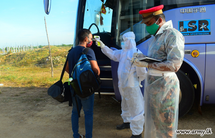 Upon completion of the quarantine process of more than 3 weeks, one more group of 604 individuals proceeded back home from the Army-managed Punani (65), Lycium Kurunegla (33), Iyyakachchi (160) Vidaththapalei (60), Dolphin Hotel (29) Heikiththa (01) and Air Force-managed Mullaittivu (256) Quarantine Centres (QC) this morning (10) after necessary medical formalities and receipt of quarantine certificates.