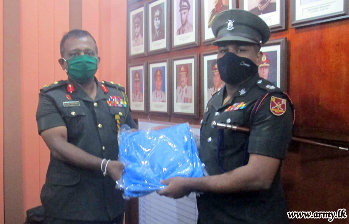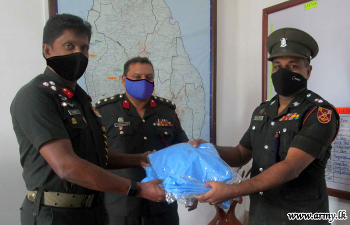 Commanding Officer of 2 (Volunteer) Sri Lanka Army General Service Corps (SLAGSC), Lieutenant Colonel C.S Demuni on Thursday (21) received 100 more Personnel Protective Equipment (PPE) overalls as a gift from the Red Cross Society, Colombo.