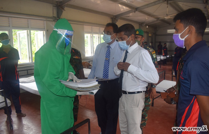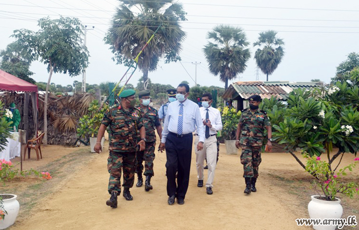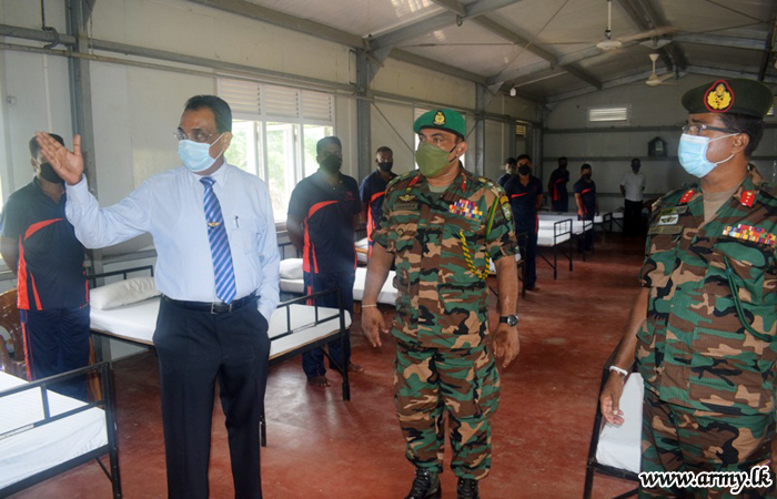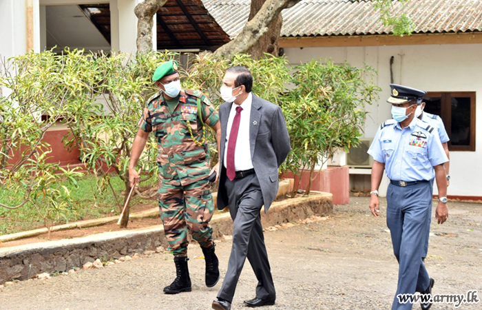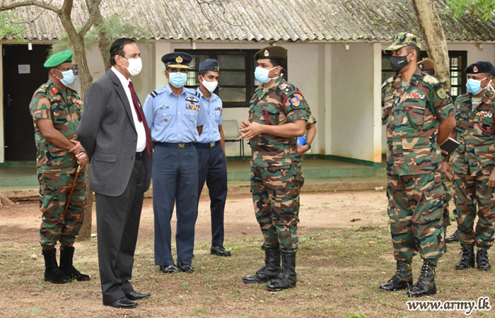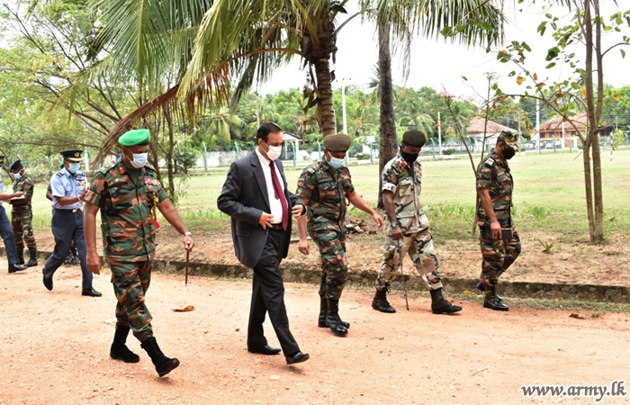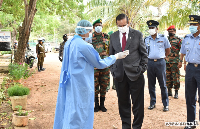 Major General (Retd) Sumedha Perera, now Secretary to Ministry of Agriculture, Mahaweli, Rural Development & Irrigation who is also a member of the PTF inspected the 24 Division HQ, 231 Brigade Headquarters and the Army-run Quarantine Centre in the 4 Gemunu Watch.