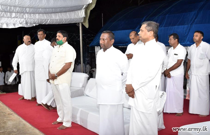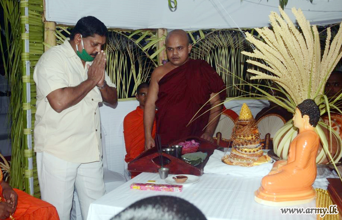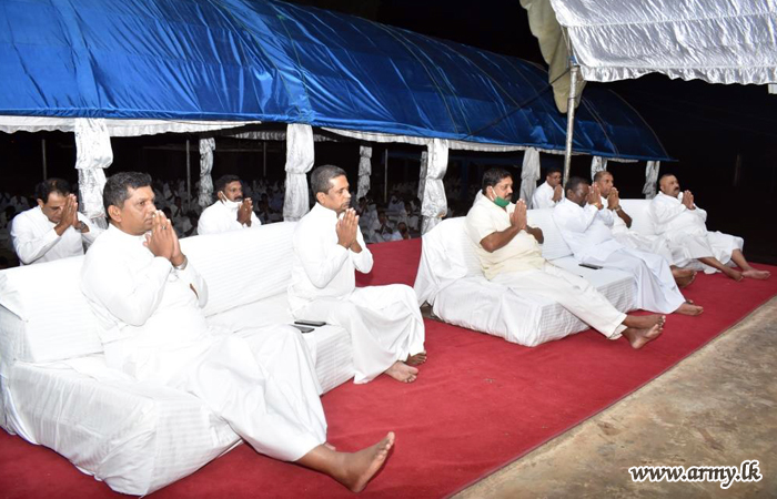 A group of 17 Buddhist monks at the invitation of Major General Deepthi Jayathilake, Commander, Security Forces - Mullaittivu on arrival were conducted to the octagen (Pirith Kotuwa) before religious observances and 'Anushasana' (orations) got underway. The formal offering of the 'Dehet Wattiya' by the Mullaittivu Commander signalled the start of the 'Pinkama'.