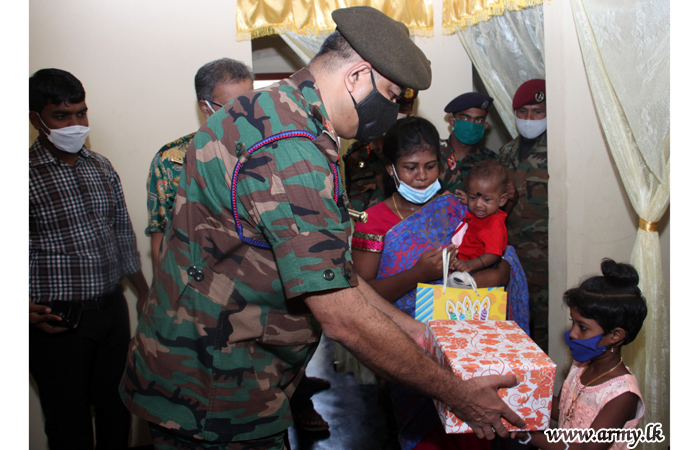Major General Ruwan Wanigasoooriya, Commander, Security Forces, together with the donor, Mr. Vamadeva Thiagendran who donated both the land and all raw materials for the construction vested the house in Mrs. Yogendran Yoki of Kopay after cutting a ribbon and performing Hindu religious observances. At the same time, special gift parcels were also given to the beneficiaries as incentives.