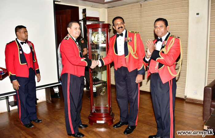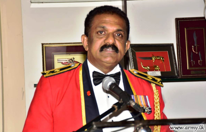 At dusk, the customary farewell dinner was hosted. After the day's Chief Guest was accompanied to the Officers' Mess, Major General T. S Bangsajayah, Commandant Sri Lanka Army Volunteer Force and Colonel of the Regt GW delivered the farewell speech on behalf of all Officers of the Gemunu Watch to show deep sense of gratitude and appreciation of the services of Major General Deshapriya Gunawardana.
