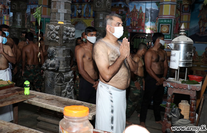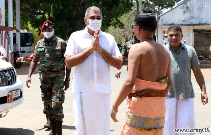 Accepting the invitation made by the Chief Kurukkal of Maviddapuram Kandaswamy Temple, Major General Ruwan Wanigasooriya, Commander Security Forces - Jaffna on Friday (10) took part in religious performances inside the Kovil.