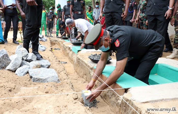 Together with the heavy-weight behind the project, Major General Ruwan Wanigasooriya, the donors laid the corner-stones for construction of this new house for the needy Mrs Manjula Gnaneshwaran. 7 Gajaba Regiment (GR) troops of the 52 Division under the guidance of the General Officer Commanding are set to carry out the construction. |