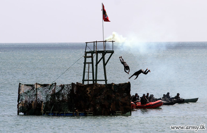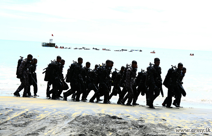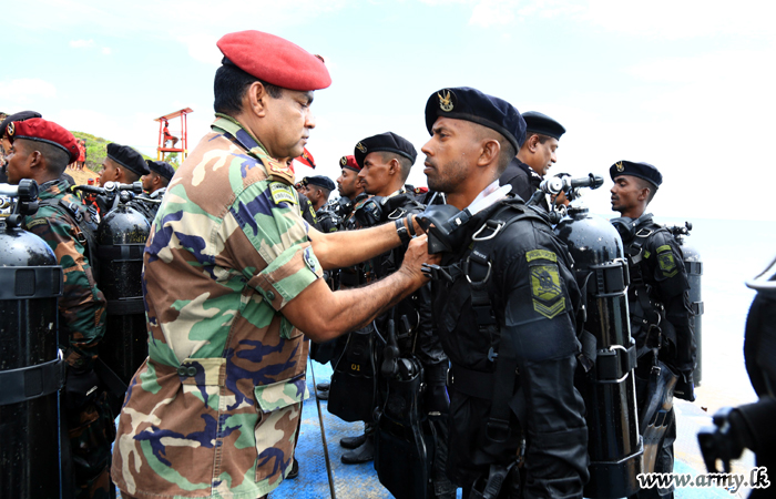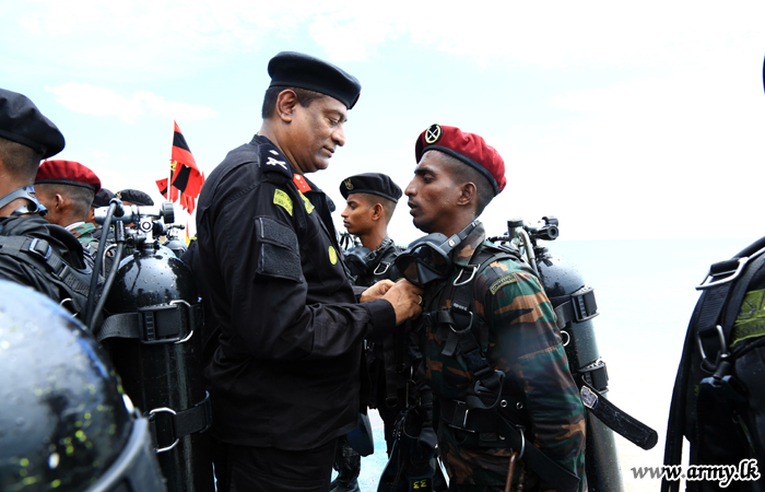 During the POP, those graduates held an exhibition demonstration of diving skills in the Nayaru seas before the day’s gathering, inclusive of Major General Pradeep Silva, Director General General Staff (DGGS), Army HQ, Major General Harendra Ranasinghe, Director General Operations, Major General Senarath Yapa, General Office Commanding, 57 Division, Centre Commandant of the Special Forces Regiment, Brigade Commander, Special Forces Brigade, Senior Officers from the SFHQ-MLT and 59 Division. |
