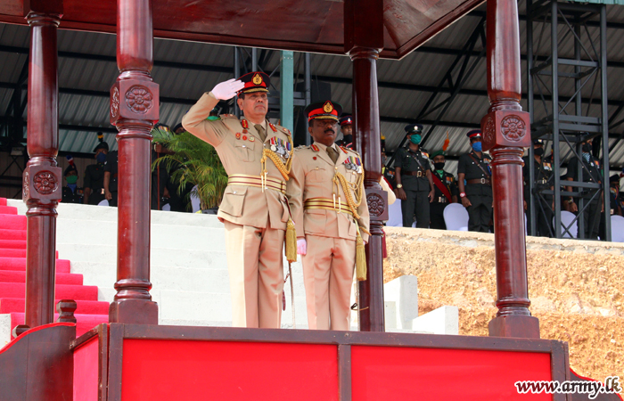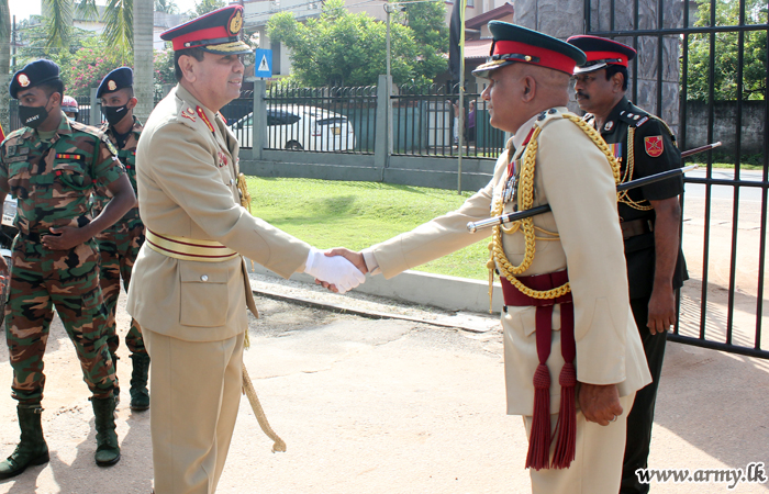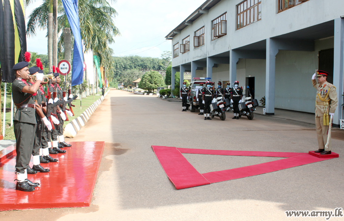 The formalities observed at Kosgama SLAVF Headquarters premises in keeping with military traditions commenced with the review of the Guard Turnout, presented by Gemunu Watch (GW) troops soon after his arrival at the entrance.