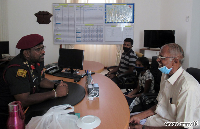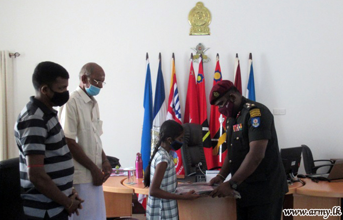 Brigadier Upali Rajapaksha, General Officer Commanding, 68 Division of the Security Force HQ-Mullaittivu with the objective of supporting needy civil community, on Tuesday (4) gifted a parcel of school items, shoes, stationery and a dictionary to a Grade-5 scholarship achiever at Wallipulam College – Puthukkudiyiruppu after inviting her and parents to the Division HQ.