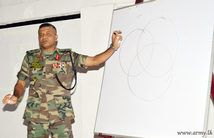The second workshop to develop the analytical thinking and competency of middle-grade officers kicked off at the 573 Brigade Headquarters of the 57 Division on Friday (07) with the participation of Officers of 571 Brigade, 573 Brigade, 7 Sri Lanka Light Infantry (SLLI), 1 Sri Lanka Sinha Regiment (SLSR), 3 Gajaba Regiment (GR) and 9 Vijayabahu Infantry Regiment (VIR) battalions under the inspirational guidance of Major General Senarath Yapa, the General Officer Commanding (GOC) of the 57 Division who initiated the project in order to innovate and re-define concepts of operations, new strategic approaches and reach to desired missions.