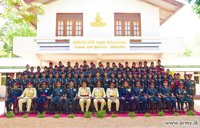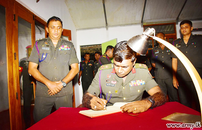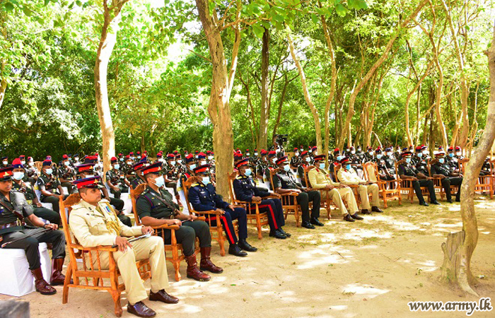 Afterwards, the Commander Security Forces Killinochchi, addressed the troops and received a brief presentation on the present role and tasks and responsibilities, deployment of troops and other details pertaining to the Regiment from the Commanding Officer. The day's Chief Guest also had a look around the camp premises and visited other storages and so on. Subsequently, he posed for a group photograph with the troops.