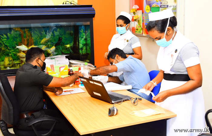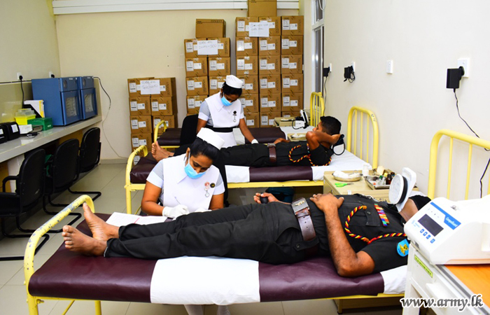 Mr. Chamara Gunawardane, PHI of the Blood Transfusion Centre requested the support of the troops to re-fill blood stocks for patients under treatment in the hospital. Forty two soldiers from the Forward Maintenance Area (East) and its under command units volunteered to donate blood for this worthy cause.
