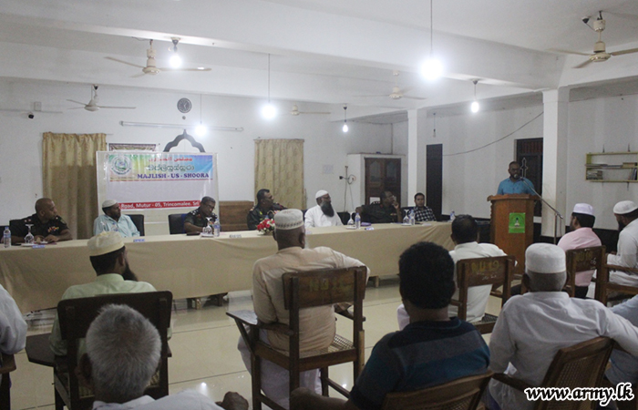 Major General Channa Weerasooriya, General Officer Commanding, 22 Infantry Division on Wednesday (12) chaired an awareness programme in Muttur area with religious leaders, community leaders and professionals of the Muslim community in order to educate the public on the importance of security and peaceful co-existence in the area at Nadhuwa Arabic School in Muttur.
