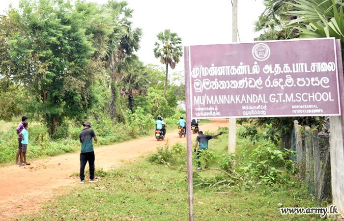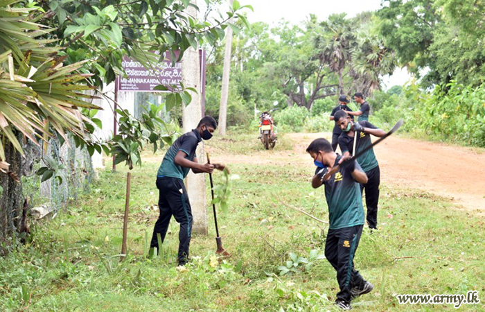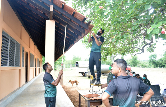 Troops of the 14 Sri Lanka Sinha Regiment (SLSR) under command to the 64 Division of the Security Force HQ – Mullaittivu in the wake of gradual re-opening of public schools after the deadly epidemic recently carried out a thorough cleaning programme inside the Mannakandala Primary school, together with teachers, parents and students.
