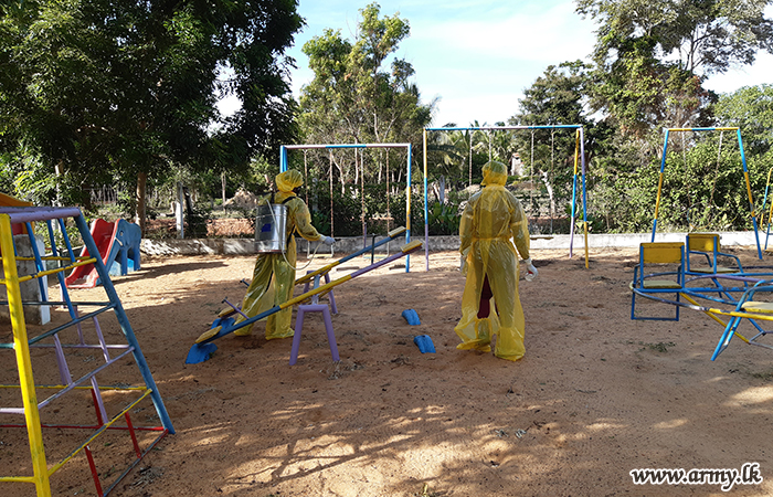 7 Gemunu Watch (GW) troops under command to the 681 Brigade under the 68 Division of the Security Forces-Mullaittivu (SFHQ - MLT) as one more of their community projects disinfected and sterilized the Mathusha preschool and its premises in Theravil before it was reopened.