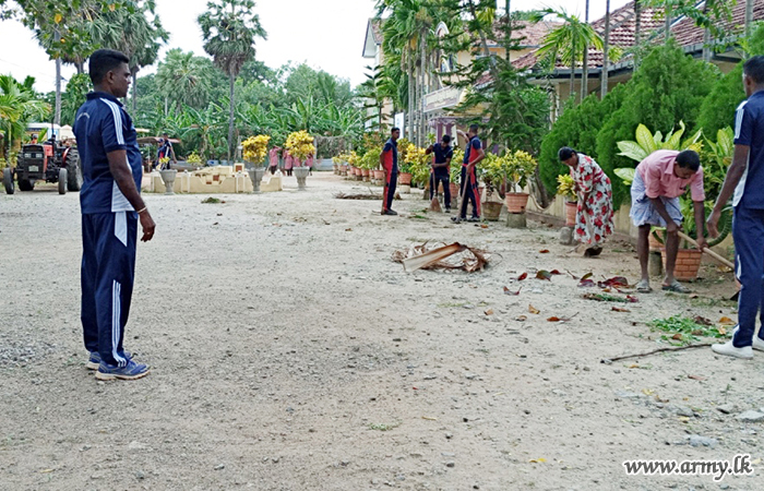 17 (Volunteer) Sri Lanka Light Infantry troops of the 653 Brigade under the supervision of their Commanding Officer on Sunday (16) carried out a self-cleaning (Shramadana) community project inside the Mallavi Central College premises on the eve of its re-opening.