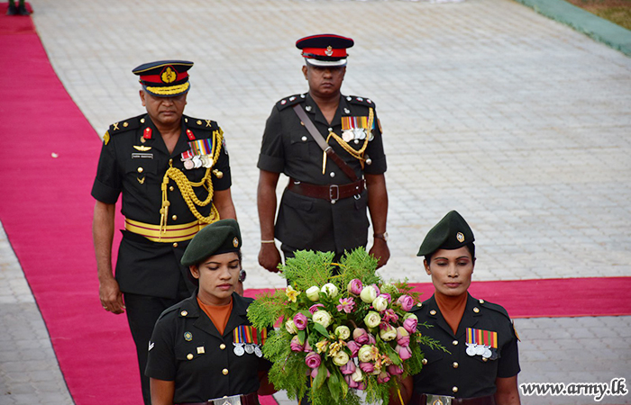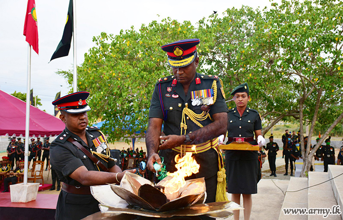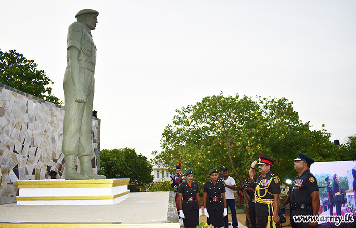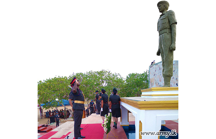 Major General Sampath Kotuwegoda, Commander, Security Forces - Kilinochchi graced the occasion as the Chief Guest and ignited the eternal lamp near the statue and revered the heroic memory by placing a floral wreath at the foot. General Officer Commanding, 66 Division and Senior Officers followed suit and paid their respect by placing floral wreaths.