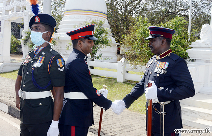The day’s programme kicked off after the day's protagonist, Warrant Officer-I L.H.T.D Sarath Kumara arrived at the parade ground to be received in a formal welcome by WO - I M. R. G. C Kulasooriya of the Vijayabahu Infanrty Regiment (VIR) who is also the Sergeant Major at Diyatalawa Sri Lanka Military Academy (SLMA).