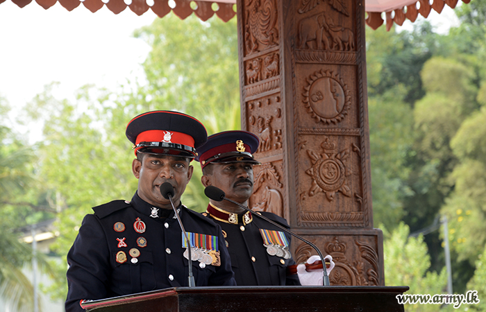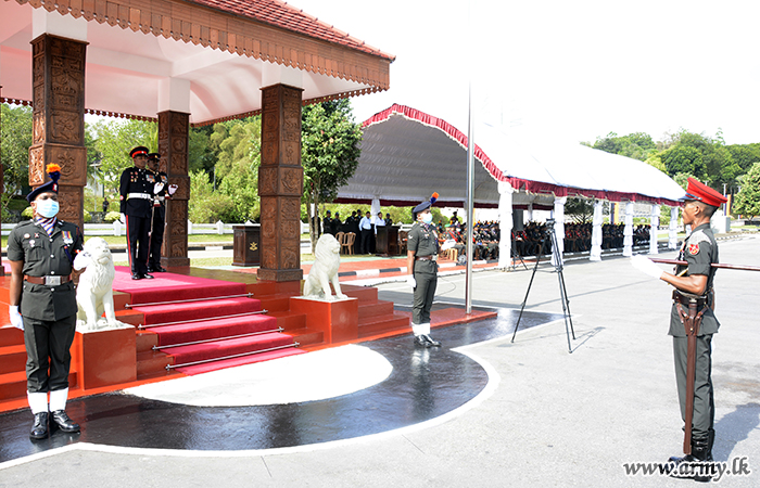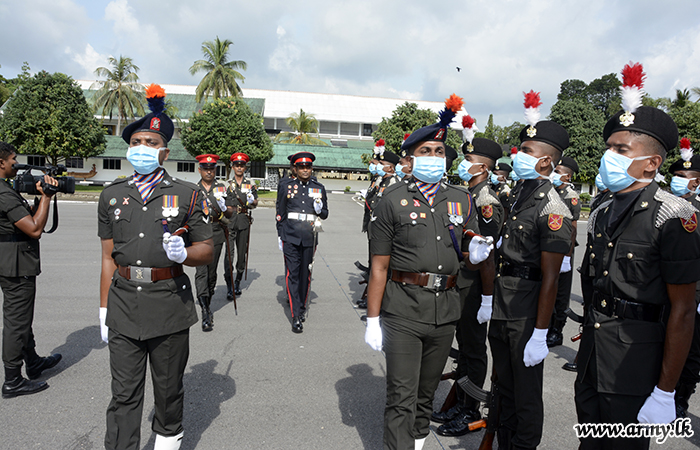 The retiring Warrant Officer-I L.H.T.D Sarath Kumara accompanied by the Parade Commander, WO-I B. D Saminda, RSM, Sri Lanka Armoured Corps (SLAC), together with the Drill Instructor of the Parade WO-I M. L Priyantha of the Sri Lanka Artillery in accordance with military traditions, reviewed the parade before he was presented with the customary salute after he was conducted to the saluting dais.