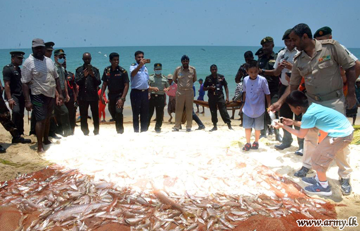 During their arrival in Mullaittivu, those student Officers were warmly received by Brigadier Upali Rajapaksha, General Officer Commanding, 68 Division on behalf of Major General Jagath Rathnayake, Commander, Security Forces - Mullaittivu. During their visit, they witnessed a demonstration on mechanism of collecting fish by fishnet (Ma-Dela). After a special presentation and a discussion held on humanitarian operations carried out by the Sri Lanka Army, the day's itinerary came to end. |