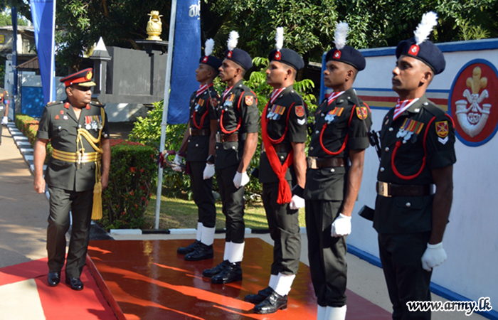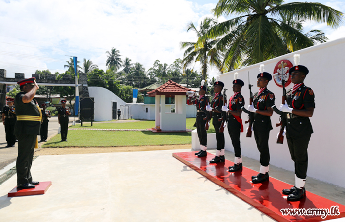 Colonel of the Regiment was accorded a Guard Turnout as a military formality at the entrance and was warmly welcomed by the Commanding Officer Lieutenant Colonel E. M. W Bandara on his arrival there.