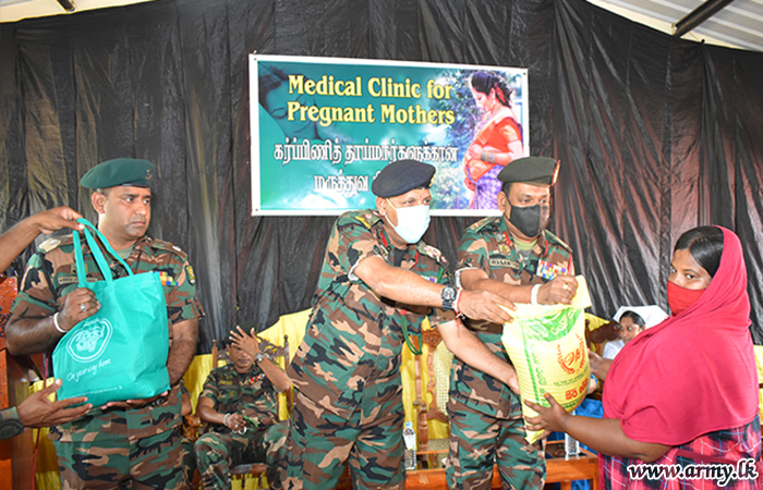 Troops of 15 (V) Sri Lanka Sinha Regiment conducted a clinic and launched a donation program to distribute essential items for pregnant women in Vilayathikulam area on Friday (28). The clinic was held under the supervision of Dr Ms S. Sujani of the office of the MOH Vauvniya.