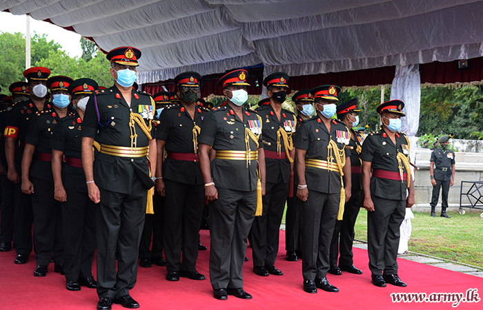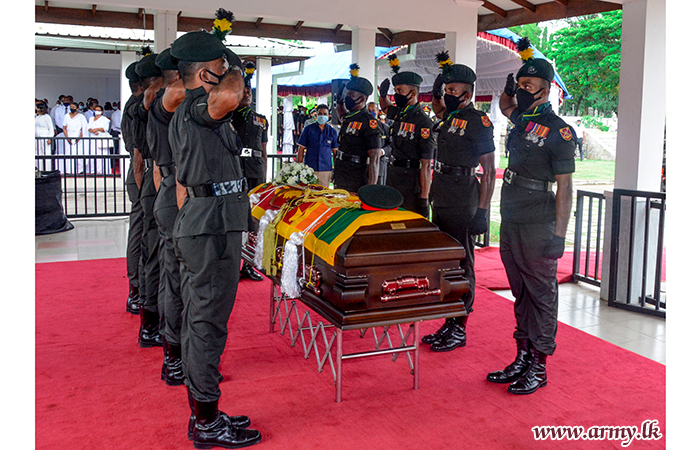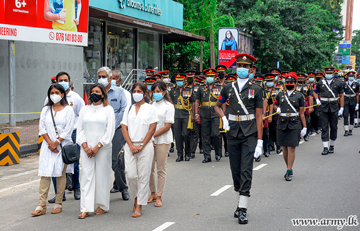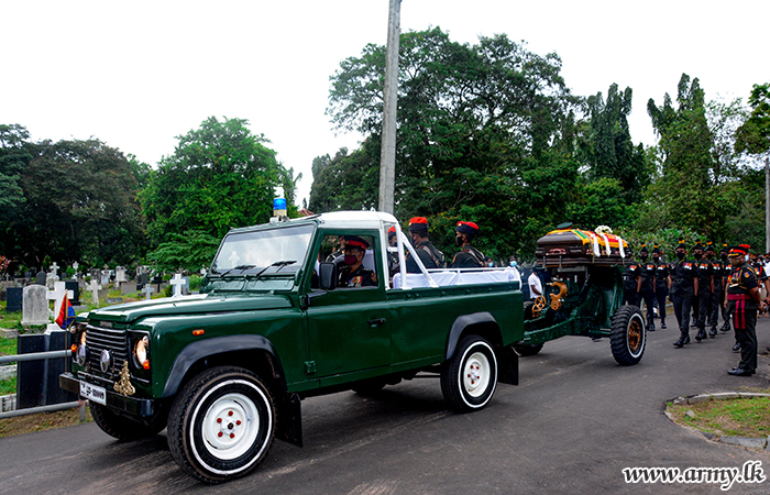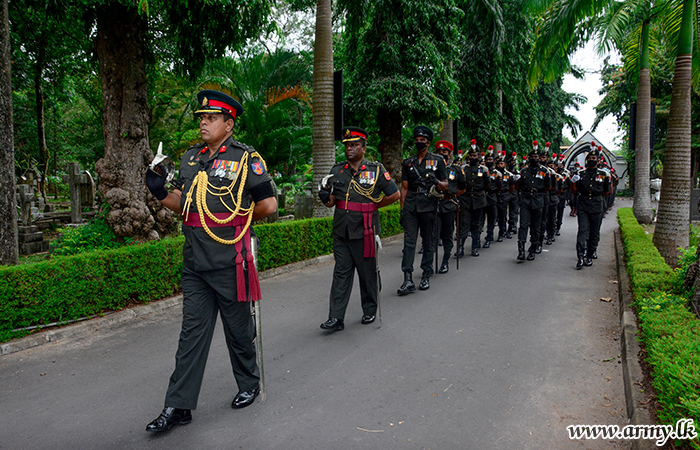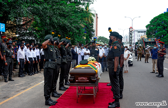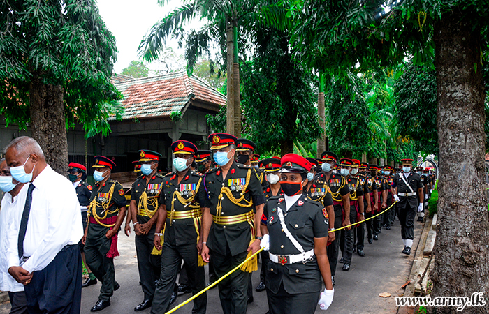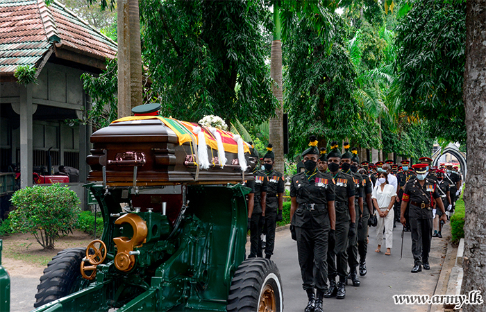 His funeral procession represented by scores of Army Senior Officers, including Major General Ruwan Wanigasooriya, Commandant Sri Lanka Army Volunteer Force (SLAVF), Major General Sena Waduge, Adjutant General, Major General Kelum Nugegoda, Deputy Commandant SLAVF, Brigadier Udaya Kumara, Director Personnel Administration, Brigadier Dammika Dissanayake, Centre Commandant of the Sri Lanka Sinha Regiment (SLSR) and several Senior Officers began marching before the troops in accordance with military traditions received the remains, presenting arms, prior to its placing on the gun carriage.