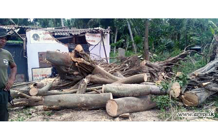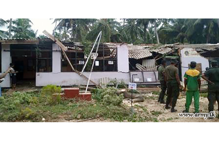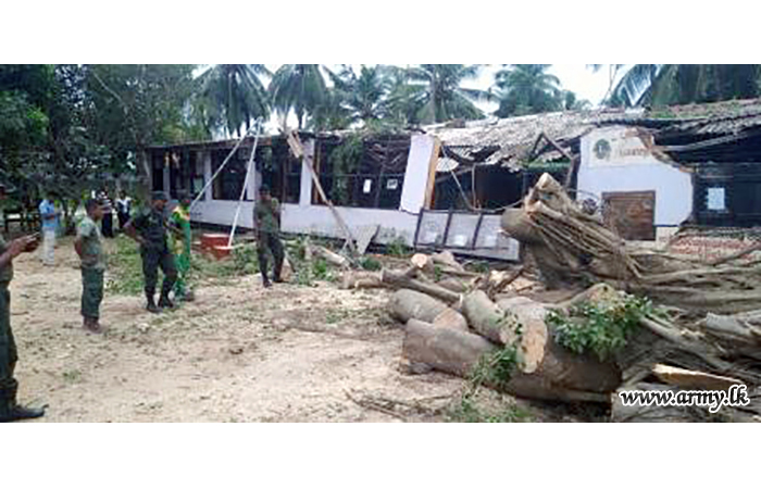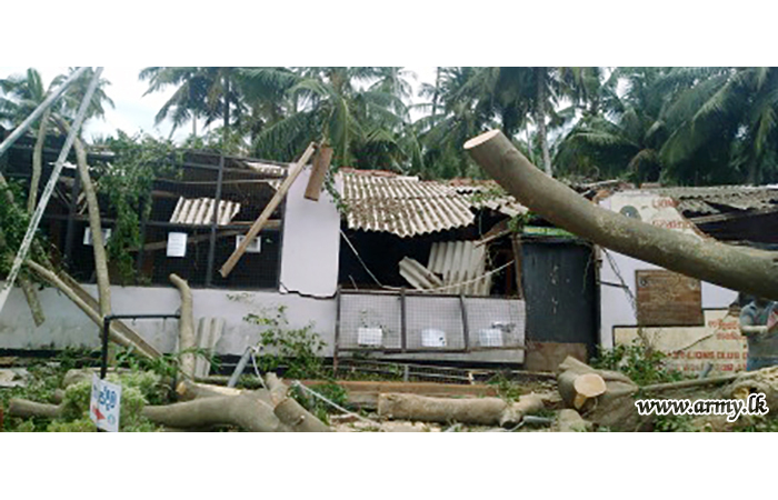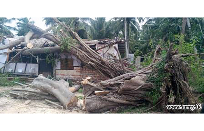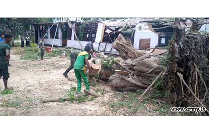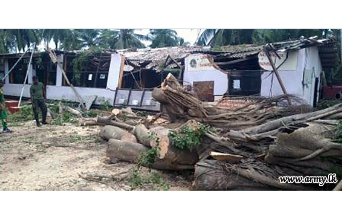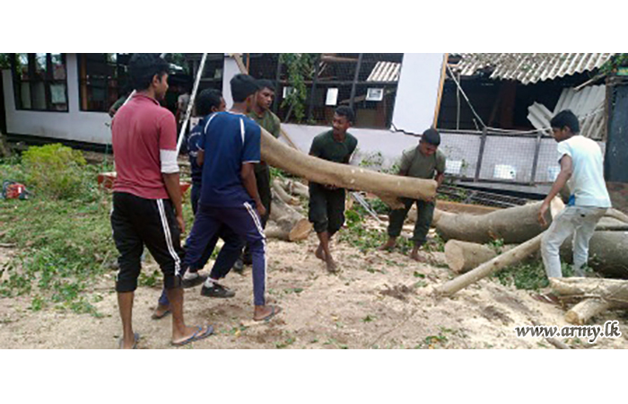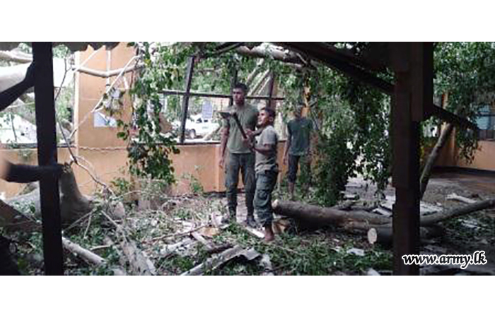 Troops of 16 Gajaba Regiment under command to the 143 Brigade and 14 Division of the Security Force HQ - West on Sunday (6) assisted the removal of fallen trees and other paraphernalia in the Mudu Katuwa National Vocational Centre compound following stormy rains and gushing winds.