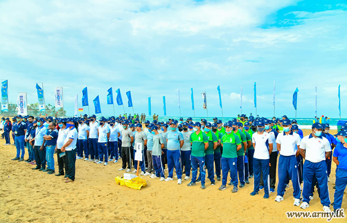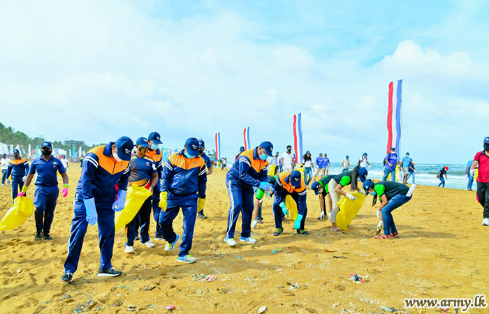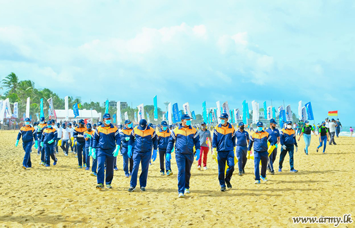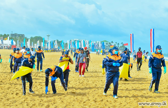 The National Marine Resources Conservation Week (19-25 Sept) that coincides with the International Coastal Cleanup Day-2020 (19 September) was inaugurated this morning (19) along the popular Mount Lavinia beach patch in collaboration with the Marine Environment Protection Authority, Ministry of Urban Development and Housing, together with a large gathering of Tri service troops and volunteers.