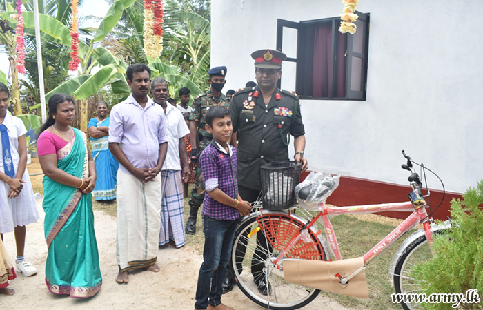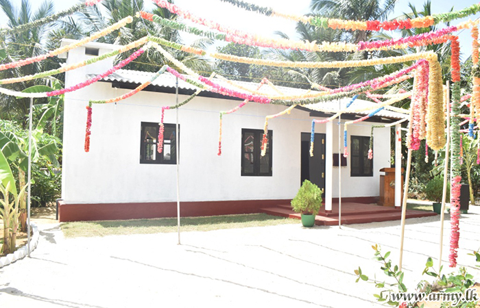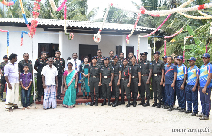 593 Brigade troops extending their technical skills and manpower, built this house on behalf of Mr Gnanaprakasam Mariyadasam in Tsunami Housing project in Nayaru who has been living with the family under economic hardships.