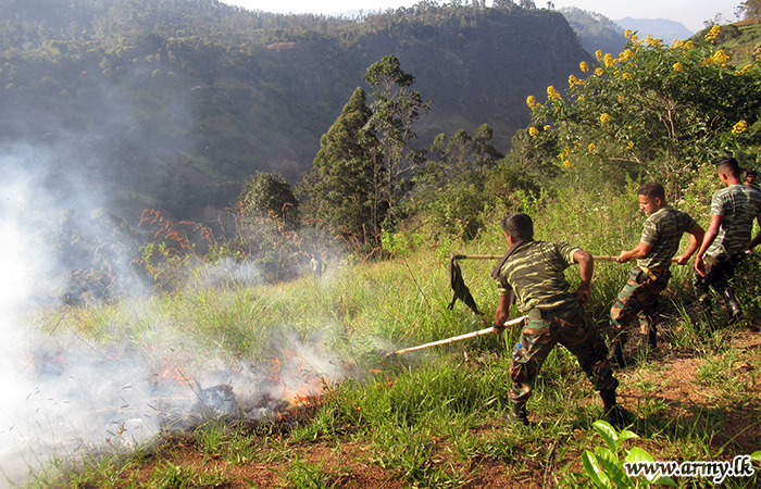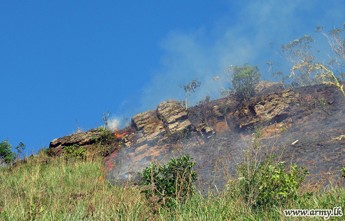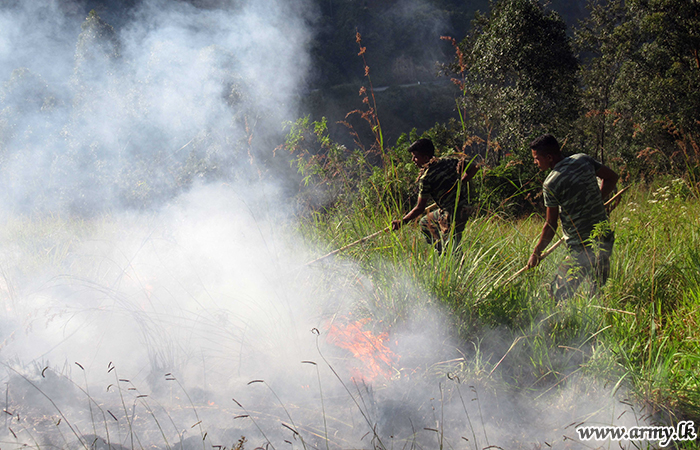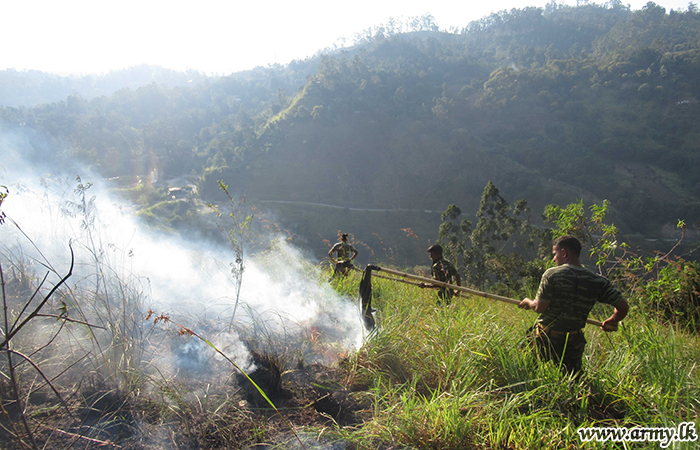 A platoon of troops of the Security Force Headquarters - Central (SFHQ-Cen) on the directions of the Commander Security Forces - Central, Major General Keerthi Costa rushed to Karagasthenna area in the Bandarawela Divisional Secretariat on Monday (05) and doused a fast-spreading bushfire in the area.