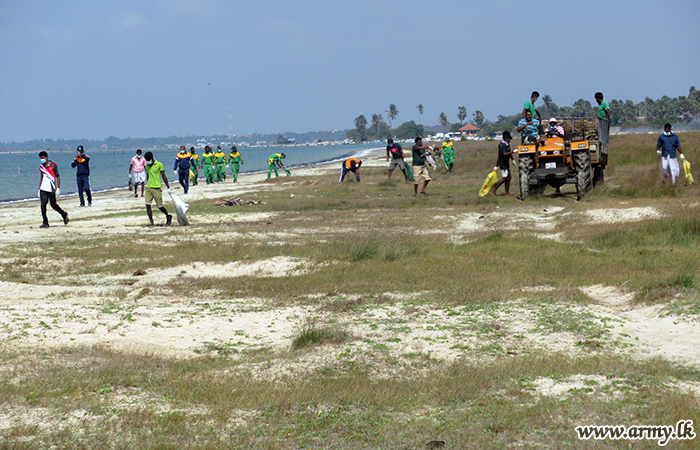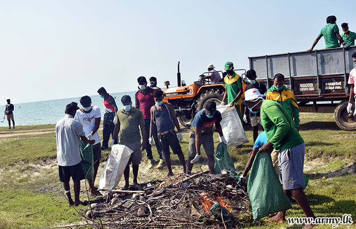 522 Brigade troops of the 52 Division HQ of the Security Force HQ-Jaffna on account of the forthcoming 71st Army Anniversary on Tuesday (6) launched a mega cleaning project along Ketpeli coastal beach up to Kilali lagoon on the guidelines given by Brigadier Kithsiri Liyanage, General Officer Commanding (GOC), 52 Division and Brigadier Janaka Wijayasiri, Commander, 522 Brigade.