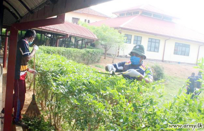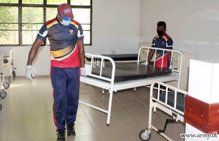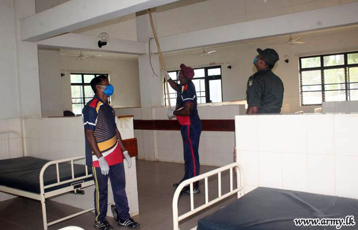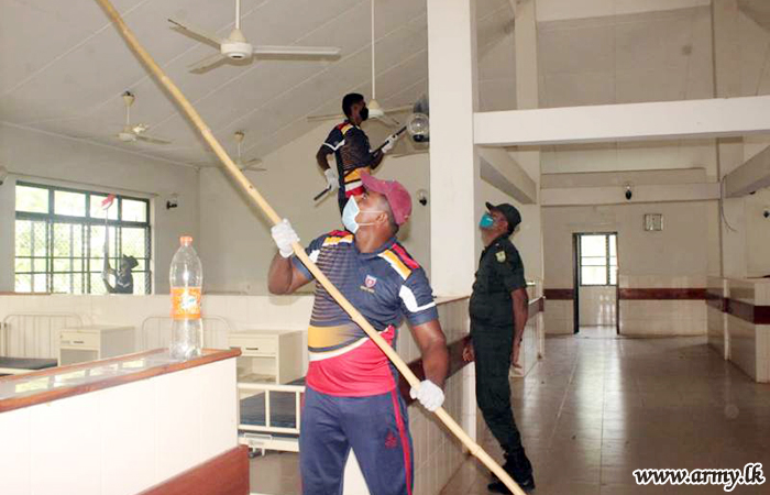 Adding their contribution to one more community project at the request of hospital authorities, the troops of 4 Battalion of the Gemunu Watch under command to 231 Brigade of the 23 Division HQ joined hands with hospital staff on Sunday (18) to clean the Karadiyanaru Base Hospital in Batticaloa, now a COVID - 19 treatment center.